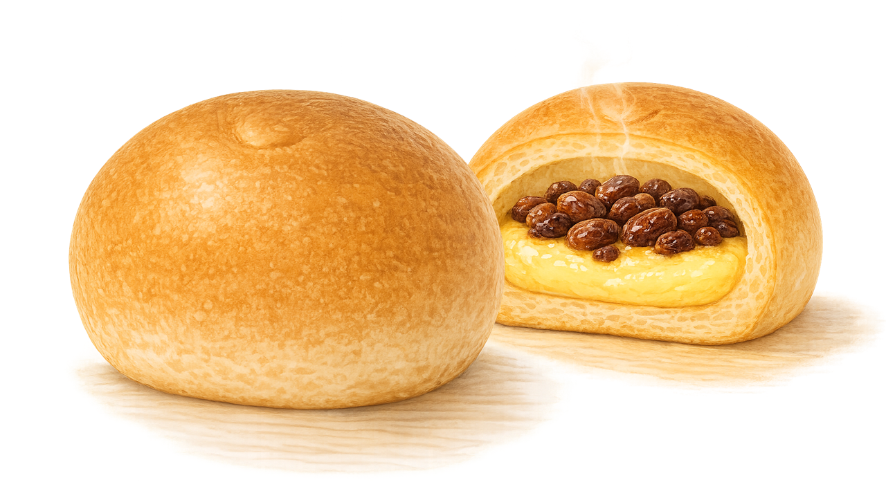 甘酸味が香り立つレーズンと、濃厚でなめらかなカスタードクリームを組み合わせた“コントラストが主役のスイーツパン”。 口に入れた瞬間はとろりと濃密、噛むほどにレーズンの甘酸っぱさが弾け、パン全体の味わいにリズムと輪郭を与えます。 大豆粉を主体としたしっとり生地がカスタードのコクをやさしく支え、甘さが重たくならない品のある後味に。 冷やして完成する温度を前提に設計され、食後のデザートとしても、小腹満たしとしてもフィットする“甘さと酸味の調和棚”の一品です。 日常のご褒美になるのに、もたれない。そんなバランスで支持される卯の花パンの定番ラインです。